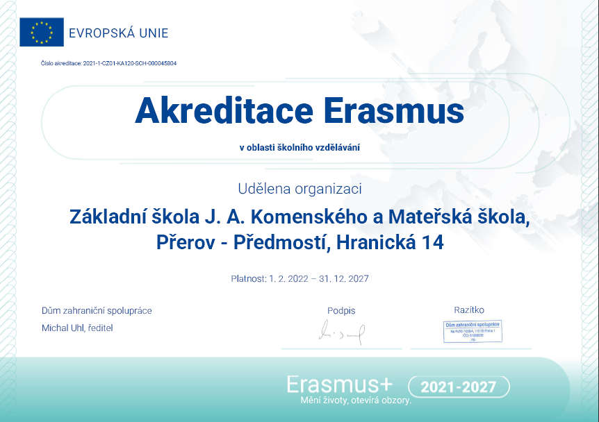 V rámci projektu Erasmus+ jsme sestavili pětiletý plán jazykového rozvoje naší školy a získali akreditaci Evropské Unie. V rámci ní můžeme v následujících pěti letech čerpat finanční prostředky a vyslat na zahraniční jazykové a metodické pobyty učitele a žáky naší školy a tím zlepšovat celkovou jazykovou úroveň školy. Náš plán rozvoje se věnuje především těmto základním bodům: